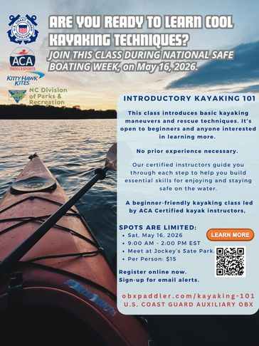 For just $15 you can learn the basics of kayaking in a class taught by American Canoe Association Instructors as part of National Safe Boating Week. Growing out of a national partnership between the American Canoe Association and the Coast Guard Auxiliary, local sponsors include:
